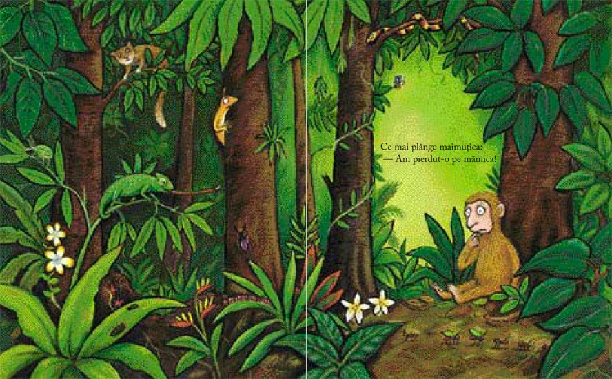 O maimutica s-a pierdut. Nu-i de mirare ca-i vine sa planga. Cum s-o gaseasca pe mamica? Dar uite, un fluture e gata sa-i sara in ajutor. Cat de greu poate fi sa gasesti pe cineva in padure? Daca stii cat e de mare, ce culoare are, cate picioare are si alte asemenea lucruri, e simplu. Sau nu?