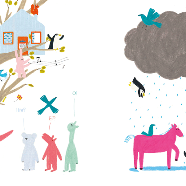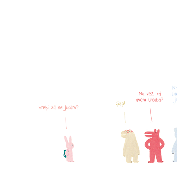 E un joc de care nu te poti plictisi niciodata cand esti copil, mai ales cand regula creativitatii este ca nu exista reguli. Iar creioane colorate are oricine. Pagina dupa pagina, iepurasul din carte deseneaza un copac, un dinozaur, o casuta, un leagan, pasari, nori, frunze, pinguini — si toate prind viata si interactioneaza amuzant cu personajele initiale. Poti si tu sa inventezi tot felul de creaturi, poti sa desenezi ce vrei si cum vrei. E si un bun prilej sa te gandesti la reguli si limite si apoi, daca vrei, sa discuti despre ele cu parintii, cu fratii mai mari sau cu invatatoarea.