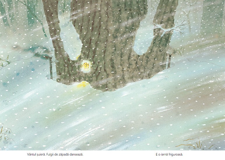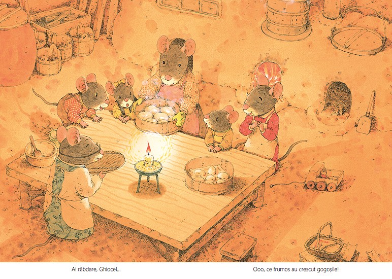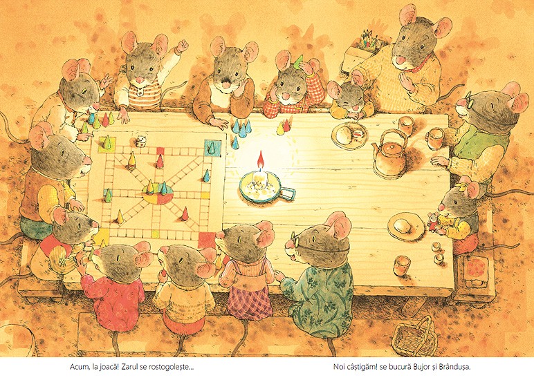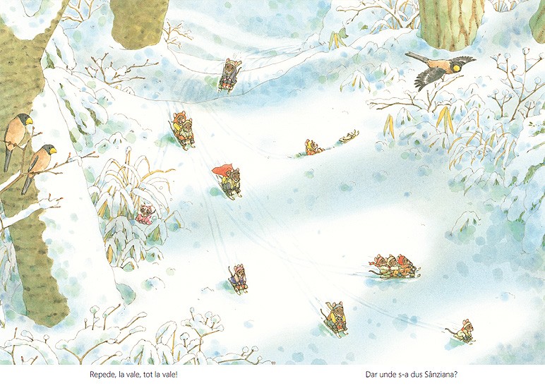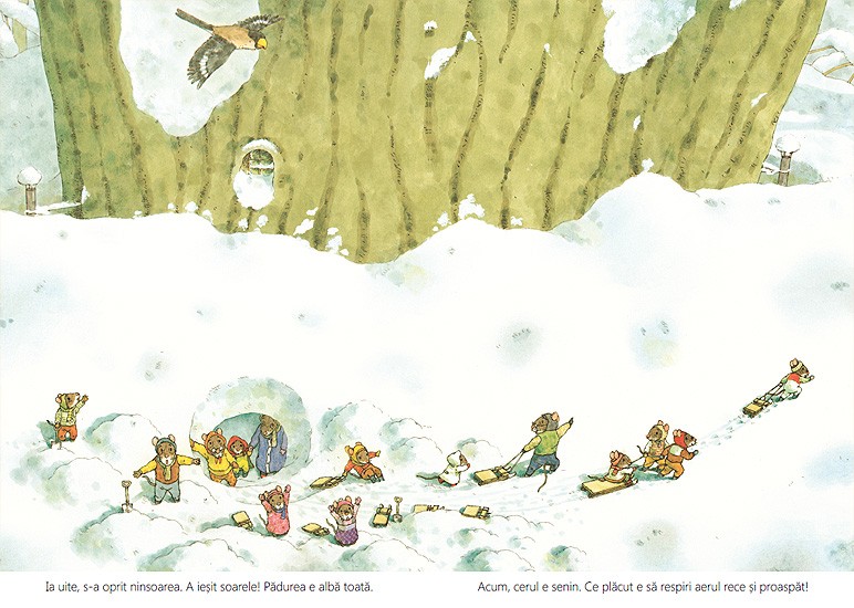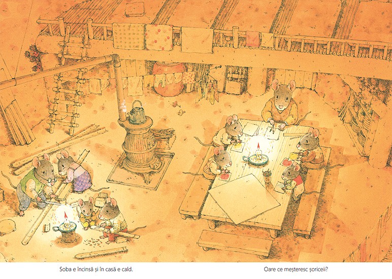 Iarna, cu gerul ei, nu-i sperie deloc pe cei din familia Soricel. In scorbura e cald, camara e plina si lemnele de foc sunt de ajuns pana la primavara. Treburi nu prea sunt, asa ca soriceii se joaca sau mesteresc cate ceva. Ce-ar fi sa construim un joc – cu tabla, zaruri si pioni? Sau sa ne reparam saniile? Sau sa facem gogosi? Cu ceai cald? Cu. Si cu dulceata. Iar daca se opreste vijelia de afara, iesim sa ne jucam in zapada? Cine o sa se dea cel mai repede pe derdelus?