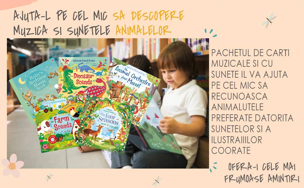 🎶 Cartile incluse in pachet sunt: Baby’s Bedtime, Jungle, Animal Orchestra, Dinosaur Sounds si The Four Seasons of Vivaldi.
