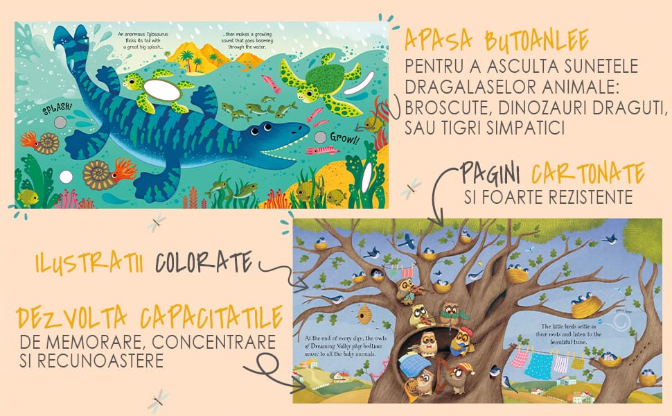 Ingenioase cu butoanele incorporate in pagini. Sunete frumoase, melodii linistitoare. Perfecte pt. cei mici!
