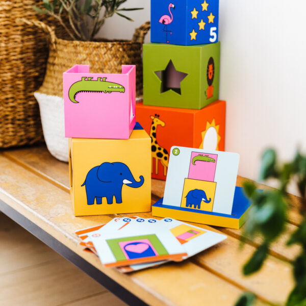 Animalele de la gradina zoologica iubesc sa se joace de-a v-ati ascunselea! Alege o provocare si incearca sa stivuiesti cuburile asa cum indica cartonasul cu provocarea. Poti gasi toate animalele? Cucu-bau! Te-am vazut! Continutul jocului: 5 cuburi din carton rezistent de calitate, 1 capac din carton, 48 de cartonase cu provocari progresive ca dificultate, un pliant cu solutiile provocarilor Varsta recomandata: 2+