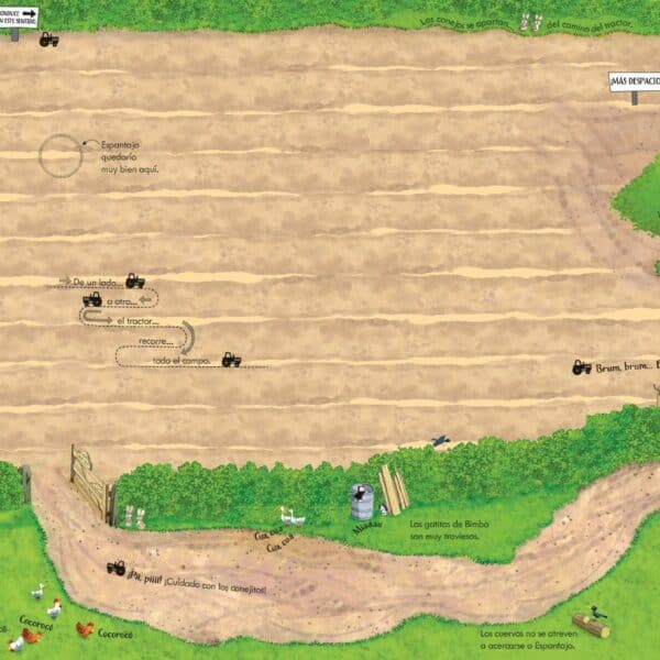 In centrul acestei aventuri se afla un tractor de jucarie, inclus in designul cartii, pe care cei mici il pot invarti si urmari pe traseele fascinante create special pe pagini. In timp ce copiii isi ghideaza tractorul prin diferitele scene ale fermei, ei se familiarizeaza cu activitatile agricole, cu animalele si cu ritmul vietii la tara.