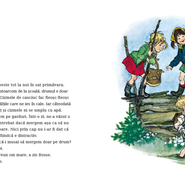 De ud, e ud peste tot la noi in sat primavara. Uneori, cand ne intoarcem de la scoala, drumul e doar o mare mocirla. Cizmele de cauciuc fac fleosc-fleosc cand calcam in baltile care ne ies in cale. Iar cateodata alunecam in sant si cizmele ni se umplu cu apa. Alteori mergem pe garduri. Intr-o zi, ne-a vazut o matusa si ne-a intrebat daca mergem asa ca sa nu ne udam la picioare. Nici prin cap nu i-ar fi dat ca facem asta doar fiindca e distractiv. „Cine a zis ca-i musai sa mergem doar pe drum?“ a spus Lasse apoi. „Probabil vreun om mare“, a zis Bosse. „Asa cred si eu“, a raspuns Lasse.