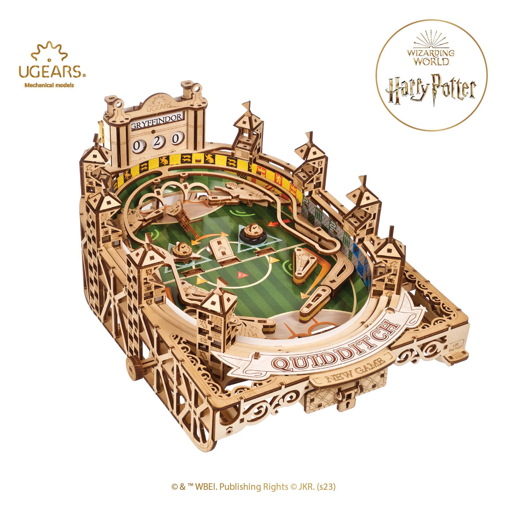 Modelul DIY Ugears Quidditch™ Pinball este un stadion impresionant din punct de vedere vizual, avand un teren de joc facut din carton imprimat cu elemente decorative, 8 platforme de vizionare ridicate gravate cu logo-urile celor patru case de la Hogwarts™ (Gryffindor™, Hufflepuff™, Ravenclaw™ si Sytherin™), un tabel de scor functional, o lada pentru depozitarea Golden Snitch™ si trei bile Quaffle™ si elemente de joc pinball functionale, inclusiv palete, bumpere, tinte si obstacole.