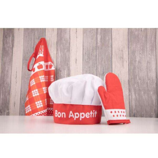 Setul cu un design modern contine: o toca de bucatar, un sort si o manusa pentru cuptor.