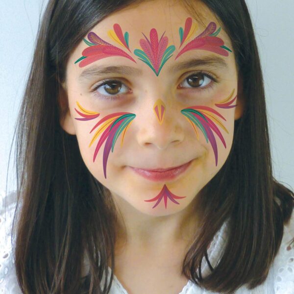 In aceasta set, copiii descopera 2 foi de autocolante cu fete. Acestea permit crearea a 4 machiaje diferite: fluture, paun, lebada sau pasare exotica. Aplicarea este foarte simpla si fara pete: trebuie doar sa plasezi autocolantul in locul potrivit pe fata. Pentru a-l indeparta, este suficient sa tragi de el.