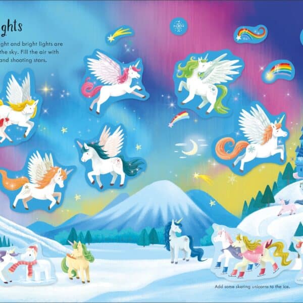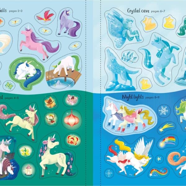 Alaturati-va unicornilor si prietenilor lor zane, in timp ce se zboara prin cascade, exploreaza pesteri de cristal si se joaca in padurea fermecata. Adauga autocolante stralucitoare pentru a da viata scenelor fantastice.