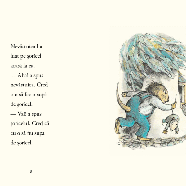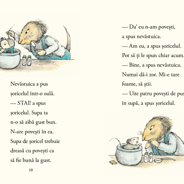 „Supa ta n-o sa aiba gust bun.“ spune soricelul cu curaj. „N-are povesti in ea. Supa de soricel trebuie dreasa cu povesti ca sa fie buna la gust.“ „Da’ eu n-am povesti“, spune nevastuica. „Am eu“, spune soricelul. „Pot sa ti le spun chiar acum.“