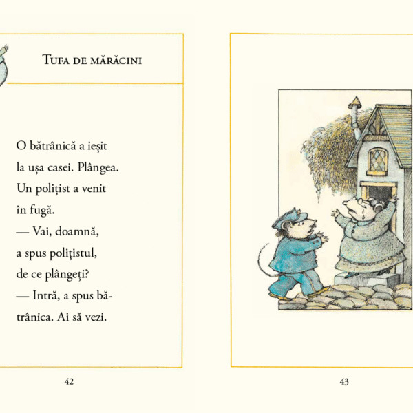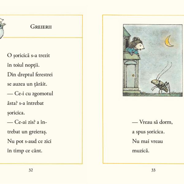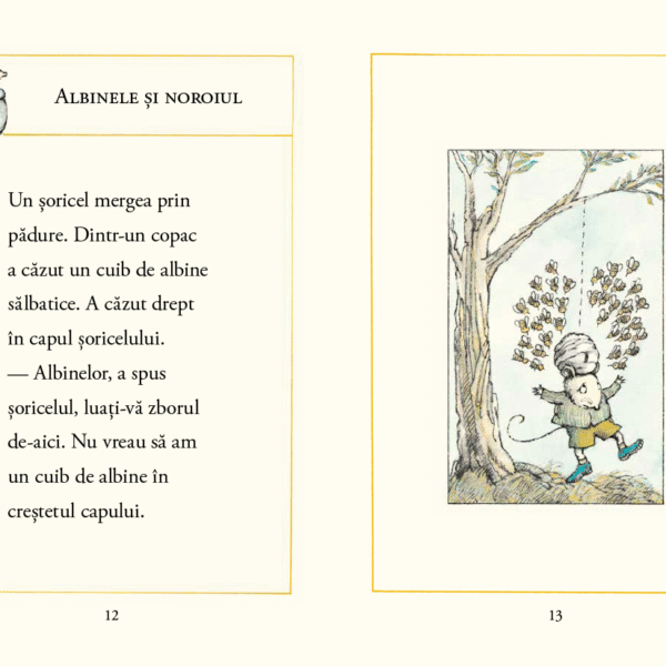 Prima poveste spusa de soricel se numeste Albinele si noroiul. Dincolo de comicul intamplarii pe care copiii il vor descoperi cu incantare, este un text despre relationare — cat de departe trebuie sa mergem pentru a-l accepta pe celalalt? Ce facem cand relatia ne afecteaza intr-un mod pe care nu ni-l dorim?