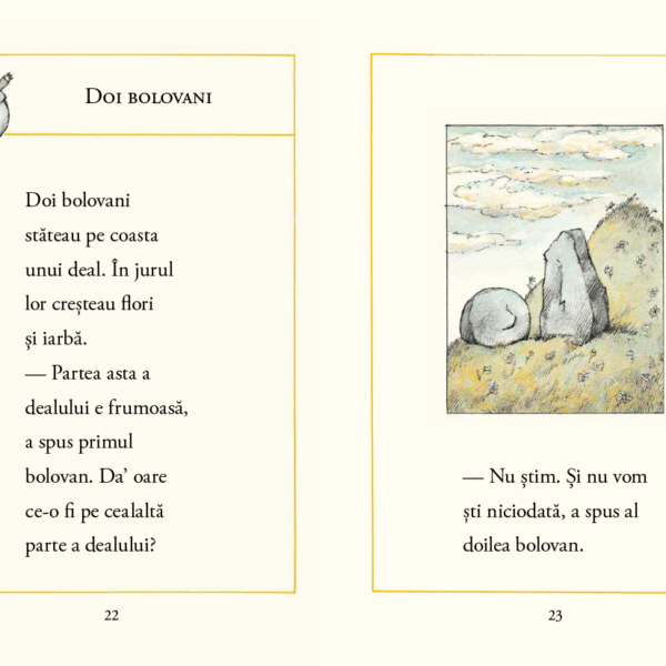 Doi bolovani este o poveste filozofica despre limitele cunoasterii si despre diversitatea punctelor de vedere. Oare ce este pe cealalta parte a dealului? se intreaba doi bolovani de pe coasta unui deal. O pasare le spune ce vede ea — orase, munti, vai — si cei doi bolovani se intristeaza. Un soricel le spune ce vede el — pamant, iarba, flori — si cei doi redevin fericiti. E exact ce vad si ei pe partea lor de deal. Insa realitatea de pe cealalta parte a dealului nu poate fi decat una singura. Sau nu? Cine are dreptate?
