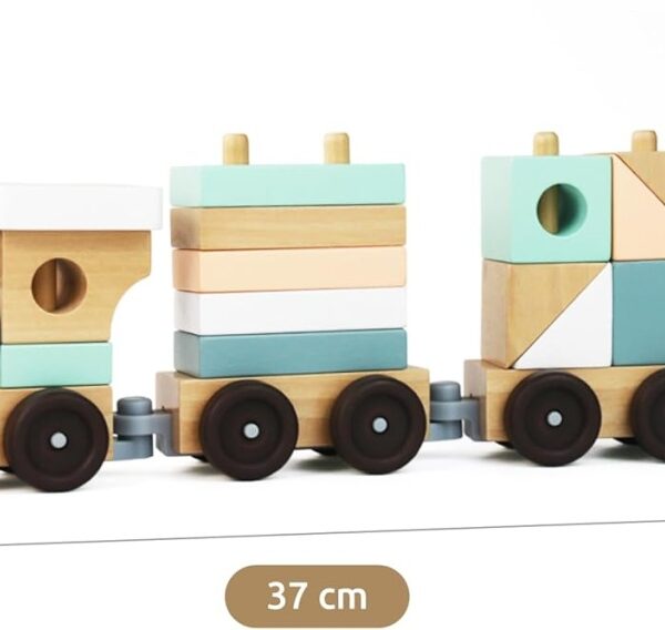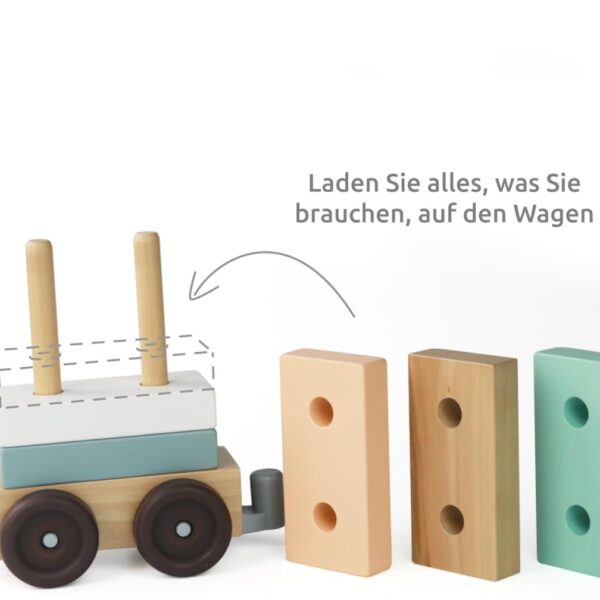 Trenulet din lemn pentru copii 2 în 1 cu 18 piese. Cei mici pot deveni nu numai mecanici de tren, ci și constructori. Trenul este format dintr-o locomotivă și două vagoane și poate fi complet dezasamblat în părți individuale. Jucăria de tras (șnur încorporat) poate fi transformată într-o jucărie Montessori pentru sortare și stivuire în cel mai scurt timp.