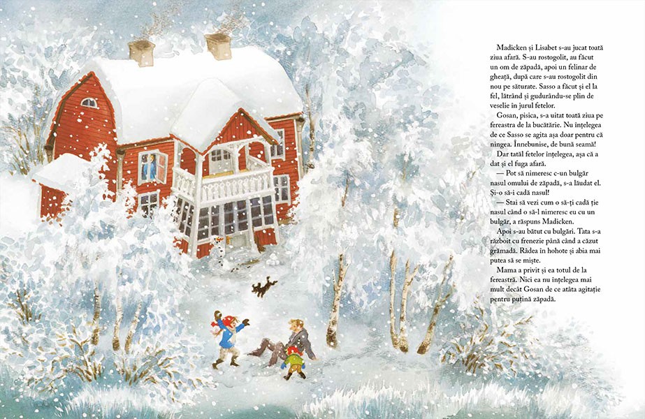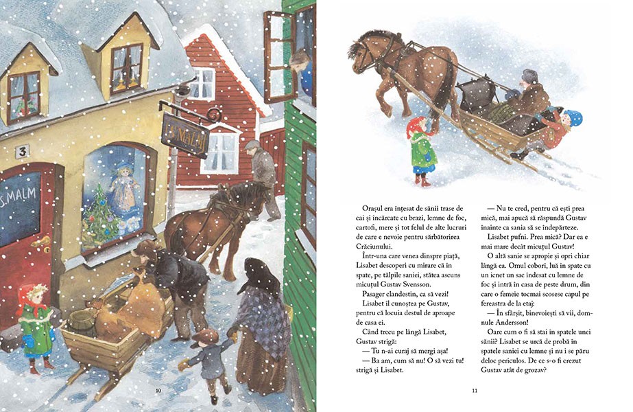 In timp ce o astepta pe matusa ei in fata unui magazin, intr-o zi de iarna, Lisabet il vede pe Gustav, un copil din vecini, cum se plimba ascuns in spatele unei sanii, pe talpi, fara stirea vizitiului. Se crede atat de grozav incat ii spune fetitei ca ea nu ar avea niciodata curaj sa faca asa ceva. Dar lui Lisabet atat ii trebuie. Cum sa nu aiba curaj? De ce crede toata lumea ca e inca mica? Uite, chiar acum o sa se urce si ea pe ascuns in spatele unei sanii. Nici nu e greu, daca se tine bine. Si e nemaipomenit sa strabati in clinchet de zurgalai orasul invelit de zapada stralucitoare. Dar sania merge din ce in ce mai repede, lasa in urma casa dupa casa si iese din oras ca vantul. Oare unde se duce? Cum o sa se-ntoarca Lisabet acasa la mama, la tata si la sora ei mai mare, Madicken?