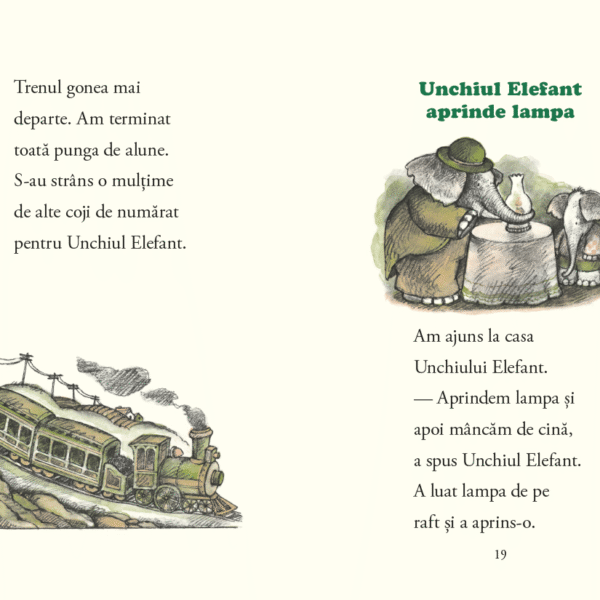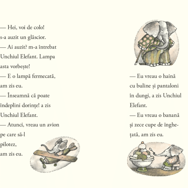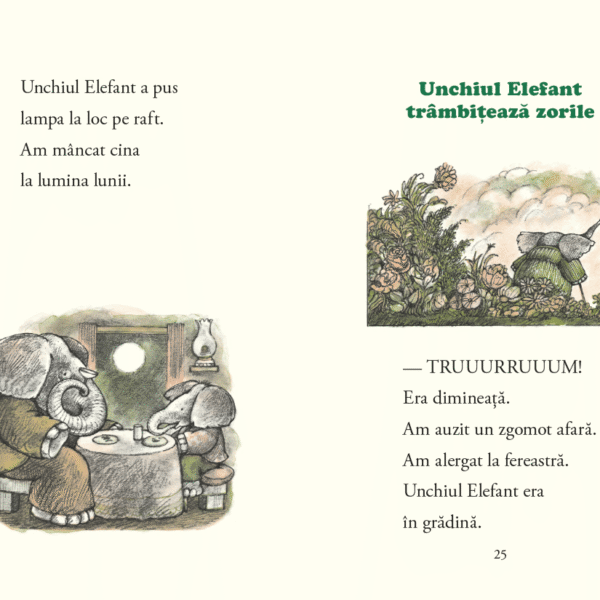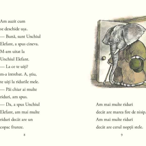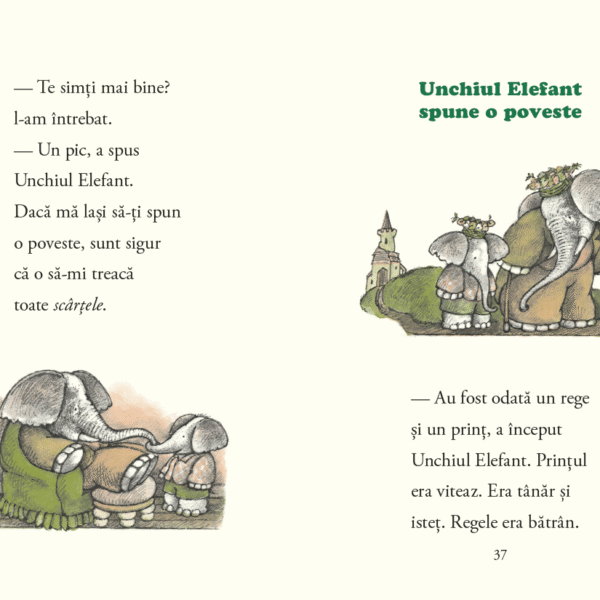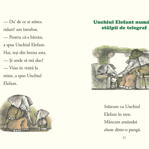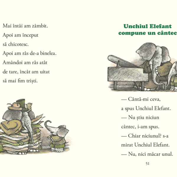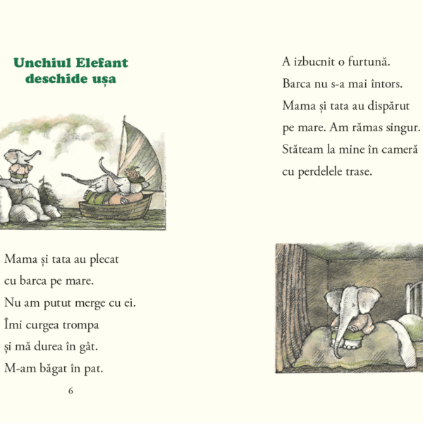 Cu rabdare si umor, Unchiul Elefant creeaza un joc, un cantec sau o poveste din orice si reuseste sa-i aline Micului Elefant tristetea. Zilele petrecute impreuna se incheie cand soseste vestea cea buna pe care o asteptau cei doi – parintii au fost gasiti si se intorc – si se transforma in sufletul Micului Elefant intr-o amintire frumoasa despre prietenie si speranta.