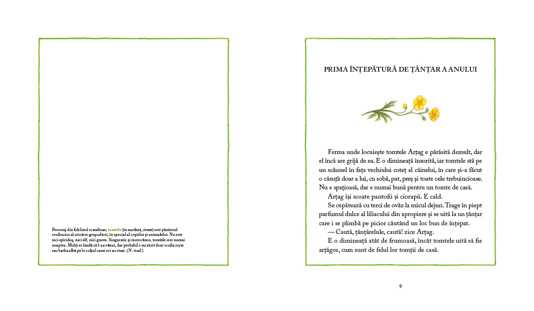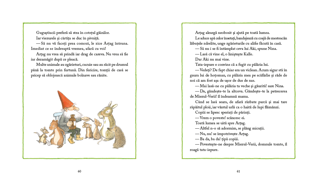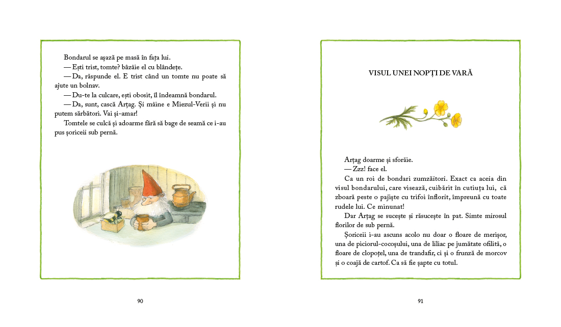 Tomtele Artag inca pazeste credincios ferma parasita de la marginea padurii. E mic, iute si mai mereu morocanos, ca orice tomte. Padurea e plina de iepurasi, veverite, arici si soricei, dar singuraticul tomte se tine departe de toti. Cunoaste multe taine ale naturii, e priceput la leacuri si la tamplarit, are un bondar sa-i tina de urat, ce ii trebuie lui prieteni? Dar o furtuna de vara si o palarie buclucasa il fac sa inteleaga ca locuitorii padurii au nevoie de el si ca oricine are nevoie de prieteni. Iar marea sarbatoare a solstitiului, Miezul-Verii, revarsa asupra tuturor puterea iubirii.