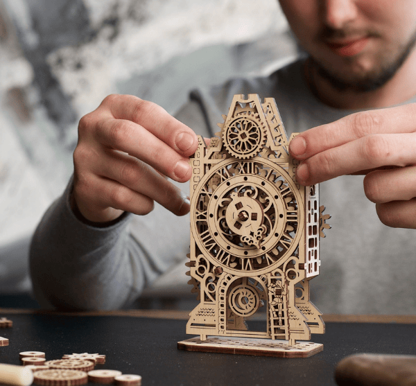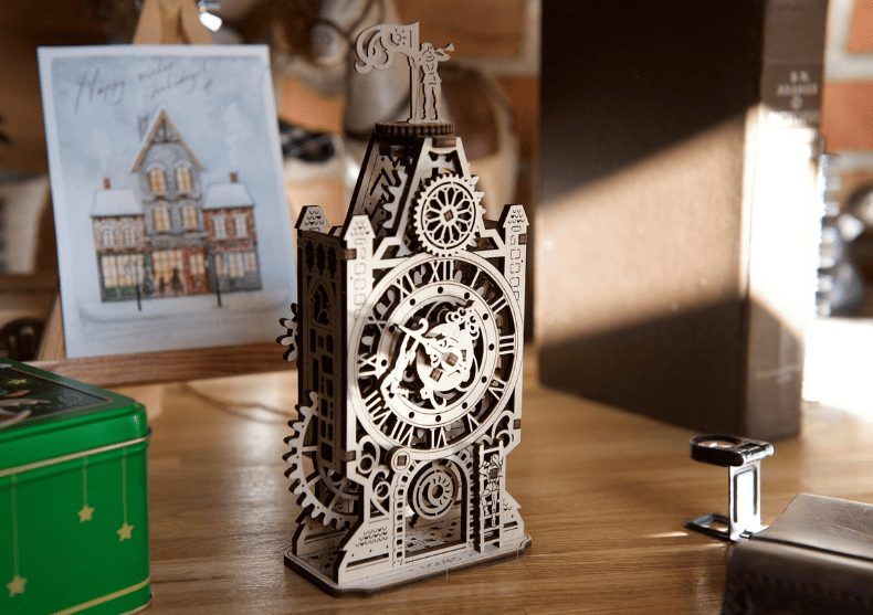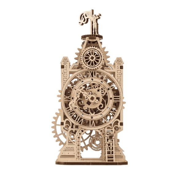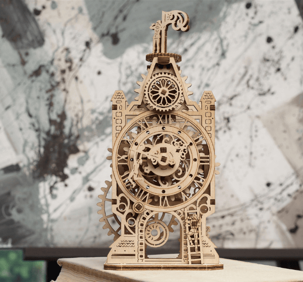 Mini-modelul Vechiul Turn cu Ceas de la Ugears aduce o atmosfera medievala fermecatoare in casa sau biroul tau. Acest frumos model din lemn DIY are un mecanism mecanic sub forma unui turn cu cadran de ceas, roti in miscare, un pendul in miscare si personaje amuzante. Derulati roata de viteza mare pentru a pune in miscare acest ceas superb, impreuna cu personajul principal, care se afla in varful ceasului cu trompeta sa. Pentru un efect comic, un barbat este suspendat de minutar. Un alt barbat urca pe scara de sub ceas, poate este un curatator sau un reparator de ceasuri? In spatele ceasului, un personaj misterios intra pe o usa ascunsa, poate este un hot care isi depoziteaza prada in turnul cu ceas, sau poate un cocosat, care isi aduce pranzul inapoi? Inventeaza-ti propria poveste in timp ce invarti rotile si vezi cum mecanismul prinde viata.