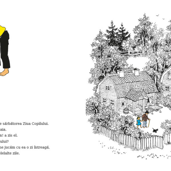 In marele oras Stockholm se sarbatoreste Ziua Copilului. Asa scrie in ziar. Daca asa scrie, atunci trebuie neaparat sarbatorita si in satul Harmalaia. Si nu oricum, ci ca la carte (sau ziar…). Se incepe cu un cantec vesel, chiar daca abia te-ai trezit din somn. Dupa aceea, te dai in carusel sau in leagan. Cat mai tare. Apoi, calaresti (pe ce gasesti), te costumezi in ceva grozav sau te dai pe tobogan. Iar daca nu prea poti sa faci toate astea ca la Stockholm, atunci le faci ca in satul Harmalaia. Fii fara grija, va fi o zi de neuitat!