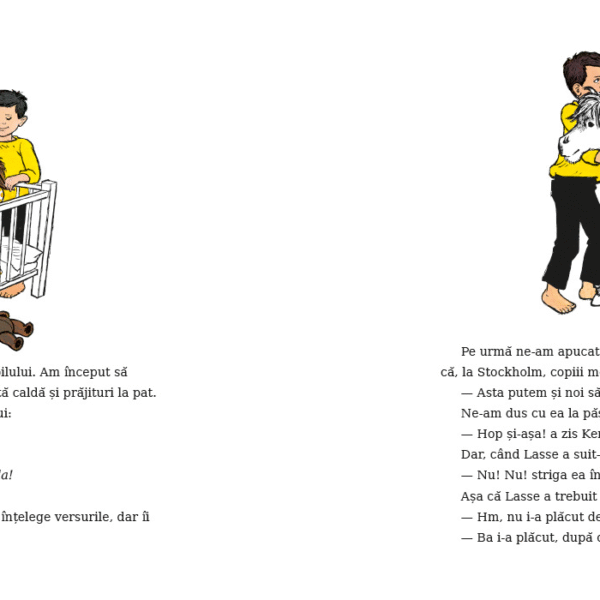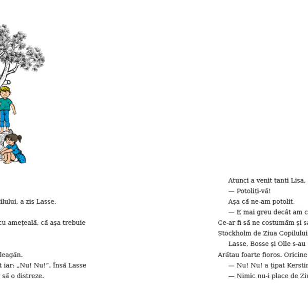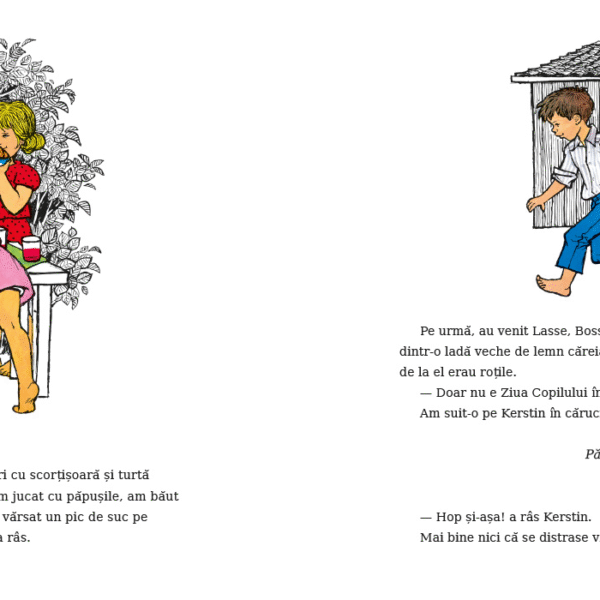 Am incercat sa-i explicam lui tanti Lisa ca nu voiam decat sa ne distram si sa-i facem lui Kerstin petrecere de Ziua Copilului, dar tanti Lisa a spus ca mai bine sarbatorim Ziua Copilului cum se face in satul Harmalaia. „Si cum se face?“ a intrebat Britta. „Un pic mai linistit“, a spus tanti Lisa. „Duceti-o sa vada gainile si purceii, de pilda.“ Cand au auzit, Lasse, Bosse si Olle n-au mai vrut sa se joace. „Daca e sa ne zgaim la porci de Ziua Copilului, mai bine ne lasam pagubasi!“ a zis Lasse. Dar eu, Britta si Anna am dus-o pe Kerstin la cotetul gainilor. Si, ce sa vezi, i-a placut! N-a tipat „Nu! Nu!“ nici macar o singura data. I-am dat graunte sa hraneasca gainile si, cand orataniile s-au inghesuit in jurul ei sa manance boabe, Kerstin a ras vesela.